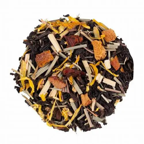Zutaten: Schwarzer Tee Assam, -Südindien, Lemongras, Apfel, natürliches Aroma, Ringelblumen, Papaya, Mangostücke, Ingwer, Sauerkirsche, Ananas. Natürlich aromatisierte Premium-Tee-Mischung mit Zutaten aus nachhaltigem Anbau.