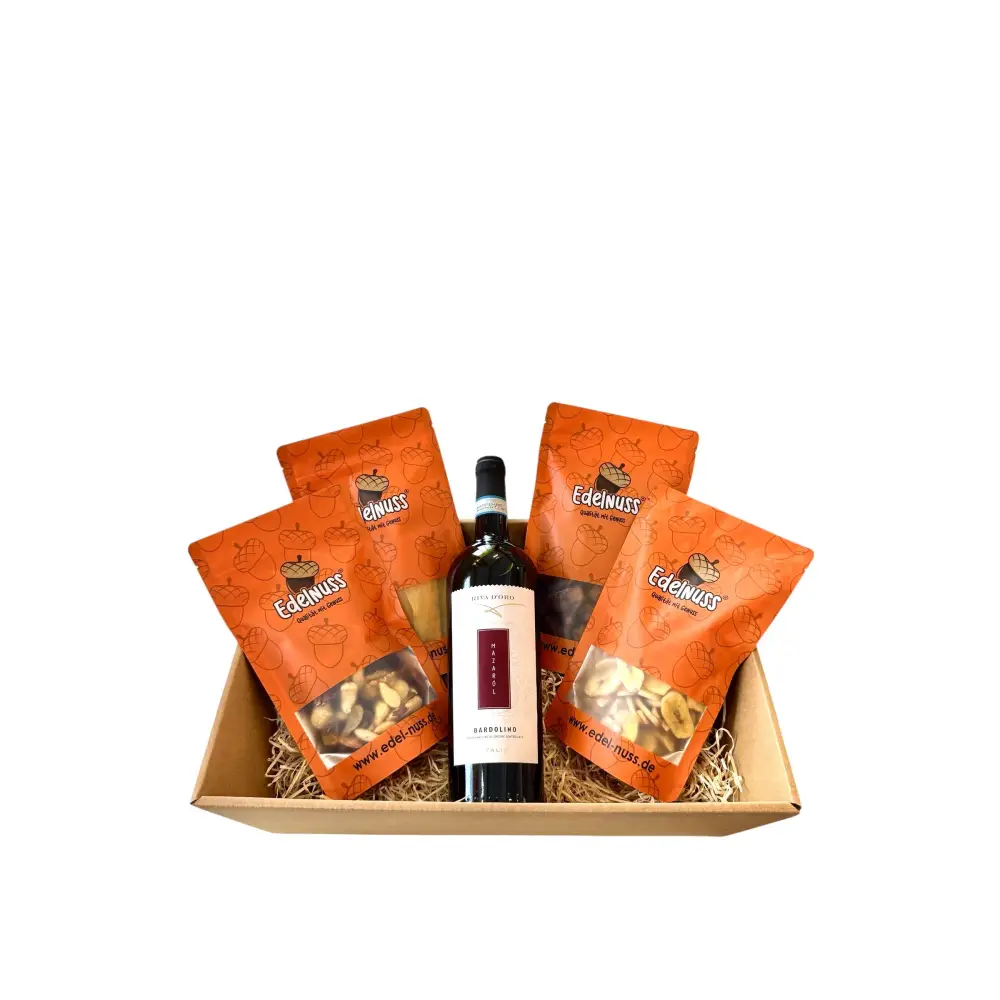 Eine exklusive Kombination aus hochwertigen Trockenfrüchten, knusprigen Snacks und einem edlen Rotwein aus Venetien. Ideal als stilvolles Geschenk oder zum Selbstverwöhnen.