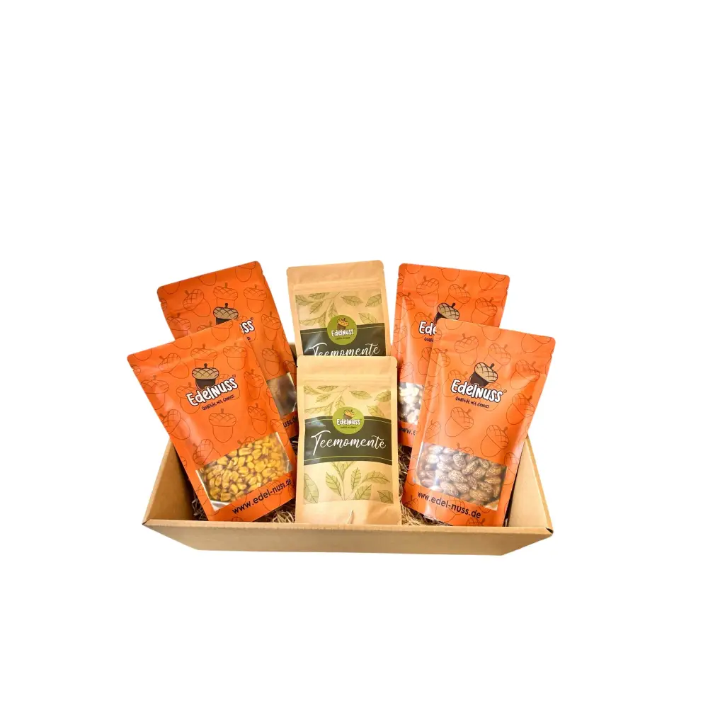 Eine lebendige Anzeige verschiedener Nüsse, getrockneter Früchte und Snacks an einem Marktstand.