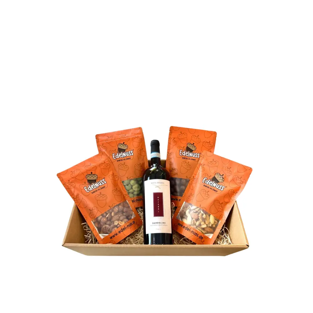 Der Nussknacker Premium Selection Präsentkorb vereint feinste Nüsse mit einem trockenen Rotwein aus Venetien – eine harmonische Kombination, die anspruchsvolle Genießer begeistert. Ob als Präsent oder zur eigenen Freude – dieser Korb steht für stilvollen Geschmack.